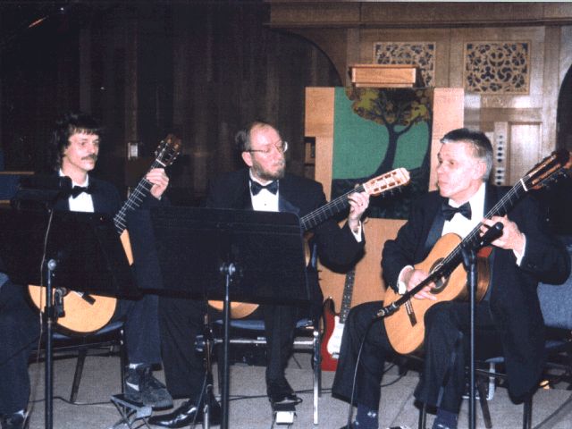 Rick introduced me to Dallas Strunk of Idaho (now deceased) and I wound up buying his serial number 002 instrument, the first he made with a spruce top. Of interest was that the tuners Dallas used were made by the late John Gilbert, a well known luthier who had once been the Chief Tooling Engineer for the Hewlett-Packard Company. The sound was nothing short of incredible. Rick too played a Strunk as did Gordon (center) in Rick's Vivaldi Trio pictured to the left.