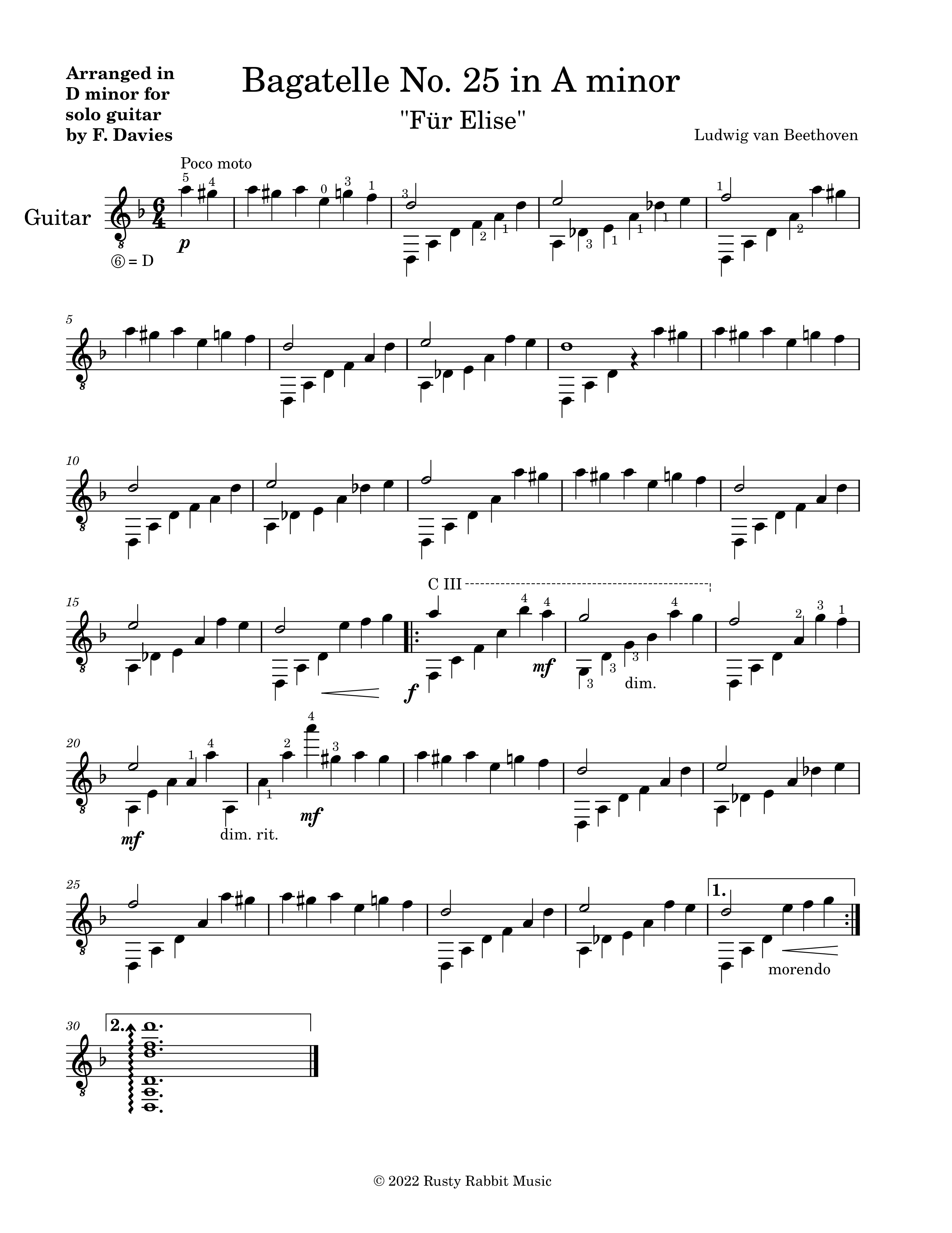 Most well known as Fur Elise, it was originally in the key of A minor. I transposed it to the key of D minor to take advantage of drop D tuning (where the 6th string is tuned down to a D) to honor the original score's ascending arpeggio often lost in other transcriptions. I've also changed it from 16th notes to quarter notes to make it easier for the beginner to read.